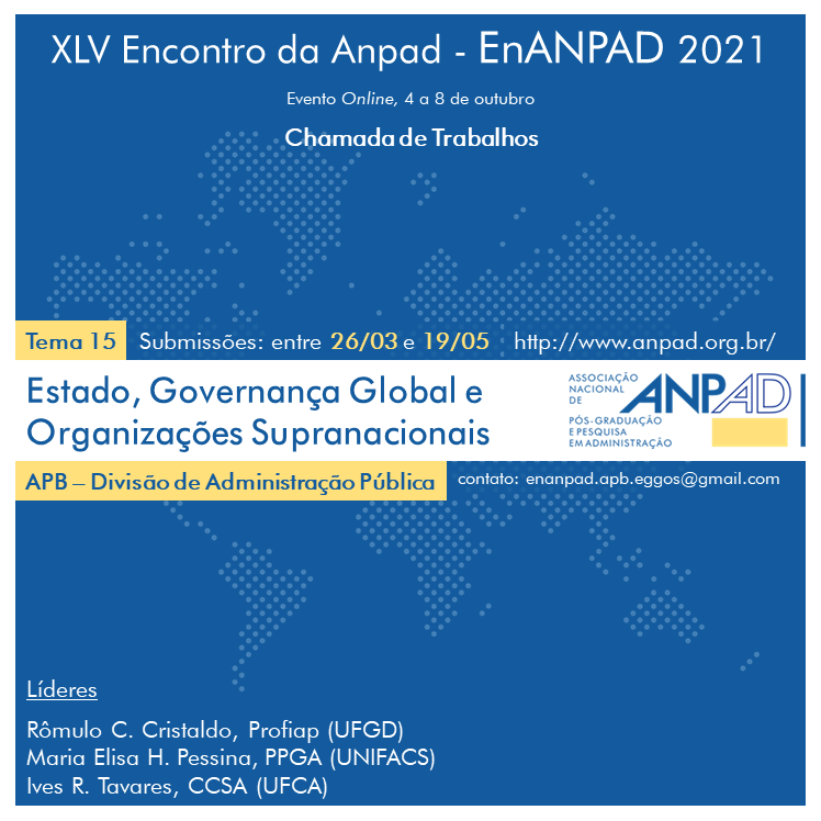 Quero vos convidar para submeter seus trabalhos sobre Estudos Oganizacionais, Administração e Administração Pública, que tenham interfaces com fenômenos e processos internacionais, no Tema 15 da Divisão de Administração Pública (APB) do EnANPAD 2021: