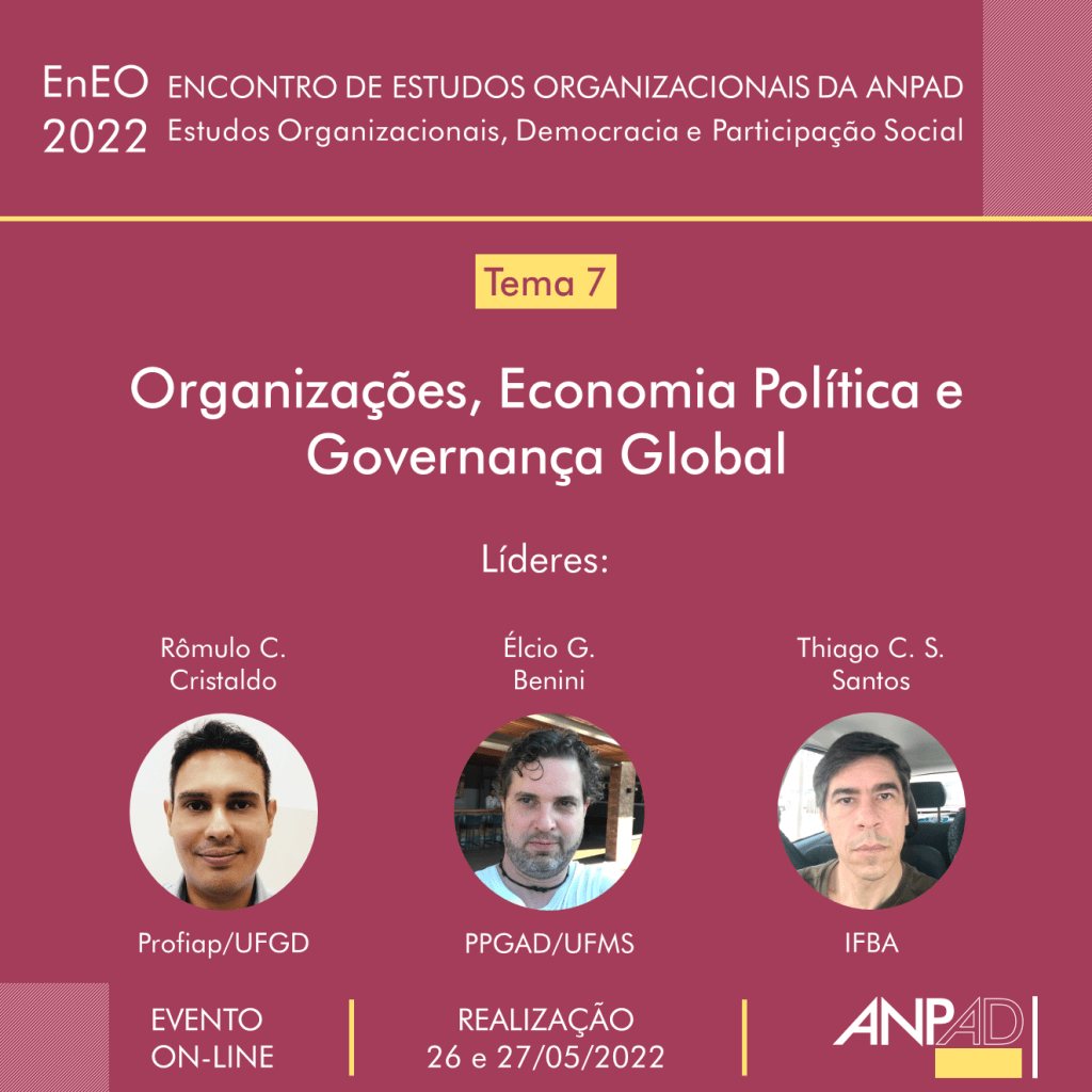 Quero vos convidar para submeter seus resultados de pesquisa, no formato de artigos, ensaios ou artigos tecnológicos, no Tema 7 da divisão de Estudos Organizacionais (EOR) da Anpad, intitulado Organizações, Economia Política e Governança Global, para o XI Encontro de Estudos Organizacionais da Anpad (EnEO, 2022).