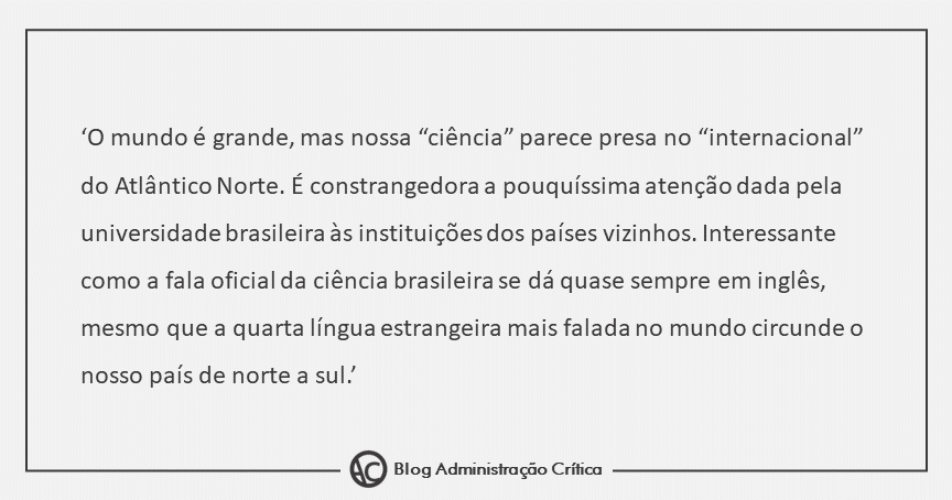 O mundo é grande, mas nossa “ciência” parece presa no “internacional” do Atlântico Norte. Não raro, acordos e convênios com universidades do Norte são celebrados como grandes feitos. Pesquisadores que mantém laços com estrangeiros de instituições radicadas em países dominantes ganham status diferenciado. Cursos e programas capazes de publicar “lá fora” nas revistas pertencentes a companhias editoras (que cobram pela publicação, mantém papers escondidos em preços caríssimos de assinatura e exigem verdadeiros malabarismos para que ajustemos inclusive nosso modo de pensar às suas práticas) são admirados e bem recompensados com dinheiro, interesse e prestígio.